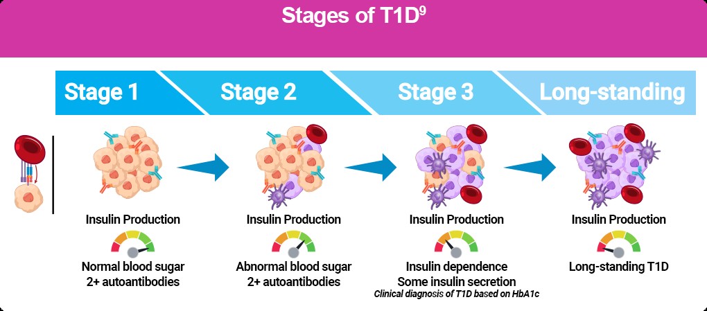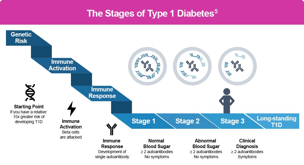 Tzield is used in stage 2 where there is 2+ autoantibodies and insulin product has started to be diminished leading to abnormal blood sugars. The four antibodies we are looking for are GAD, ZnT8A, IAA and 1A-2A. If there are more than two of these antibodies present than the person is very likely to develop Type 1 diabetes. Unfortunately in most provinces I believe we can only order GAD. For a limited time we can order test kits at no-charge to test eligible people for type 1 diabetes from the UncoverT1D program-https://www.revvity.com/ca-en/category/autoimmune-type-1-diabetes-early-detection-program . From their website eligible people include: